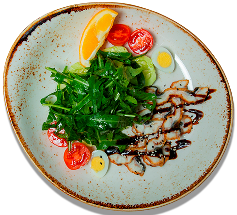 салат с копченным угрем ,огурцами,рукколой,черри,перепелиным яйцом в бальзамическом соусе