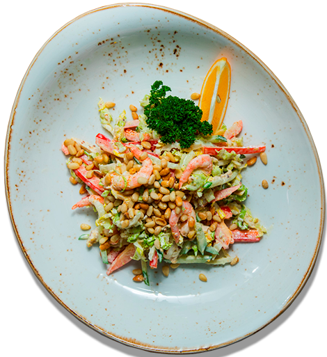 филе куриное,кальмар,огурец,креветки,перец болгарский,пекинка,майонез.горчица,кедровый орех