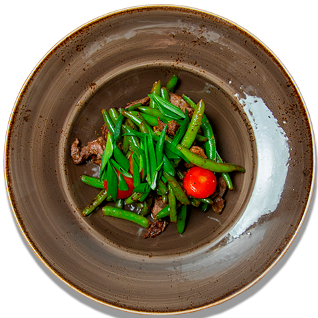 вырезка говяжья,фасоль стручковая,черри,лук зеленый,чеснок,соевый соус