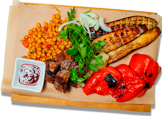 баранина и овощи жареные на мангале, подаются с нутом и гранатовым соусом