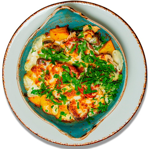 говядина запеченная на сковороде с грибами, картофелем, помидорами, чесноком, в сметаном соусе