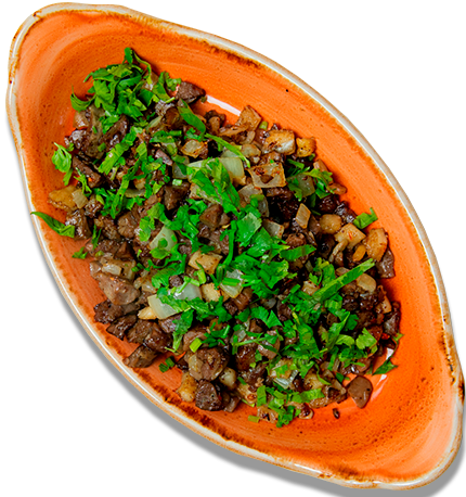 традиционное блюдо грузинской кухни,обжаренные потроха с луком и кинзой