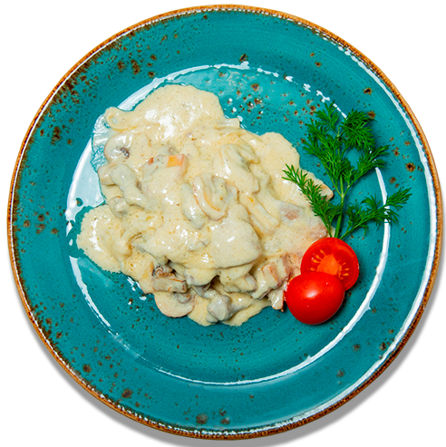свинина, шампиньоны, лук репчатый, сливочный соус