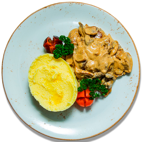 говядина ,лук,свежие грибы томленные в сливках, подаются с пюре